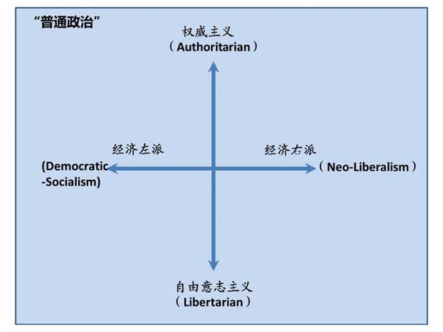 笔者将“普通政治”定位为西方主流社会总体上能够接受的政治,是落在西方当代社会能够诠释、理解的政治坐标/光谱之内的。里面任何偏向纵轴或横轴的一端的政治取态,当然是主流社会所不能认同的,但至少在他们能够理解的范畴之内,没有脱离普通政治的范畴。