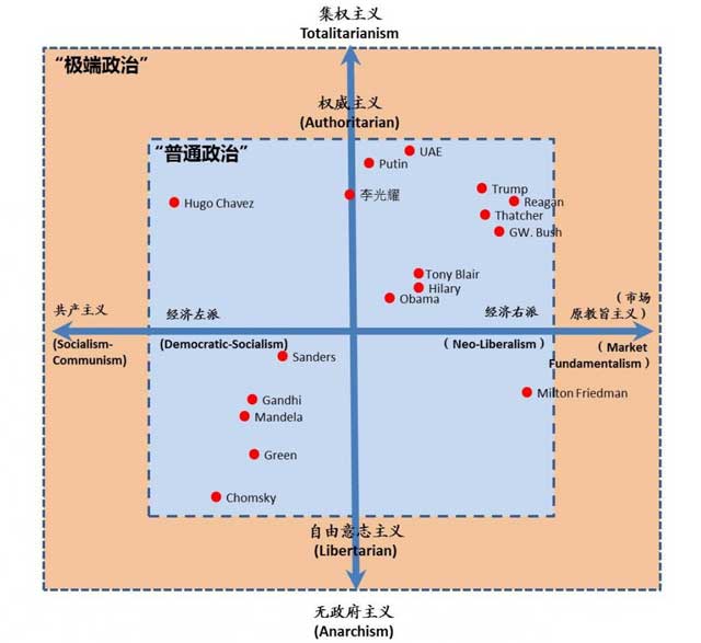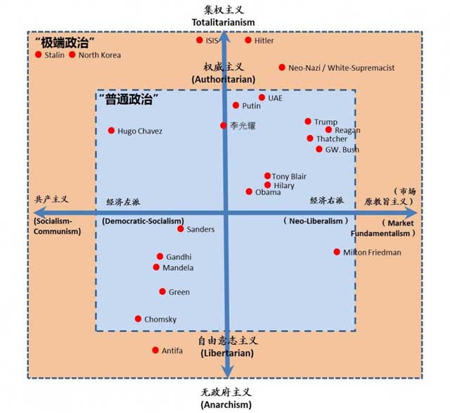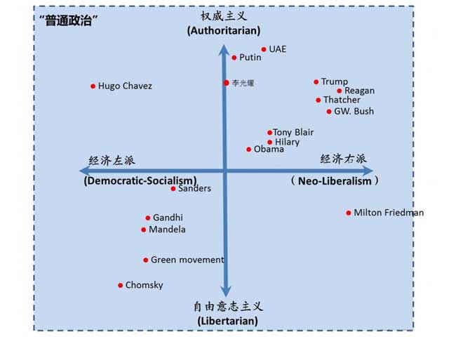 现在我们把当代的主要政治代表人物及个别政权放到这个普通政治的坐标/光谱里加以理解。