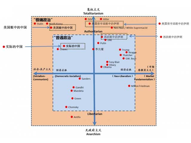 如上图,最左上角的斯大林、朝鲜,就属于西方认为极端政治(“极左”)。他们在纵轴、横轴上都突破了浅蓝色的“普通政治”区域,到达了浅橘色极端区域。